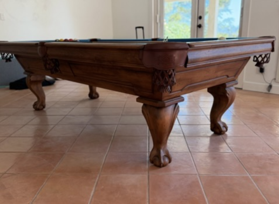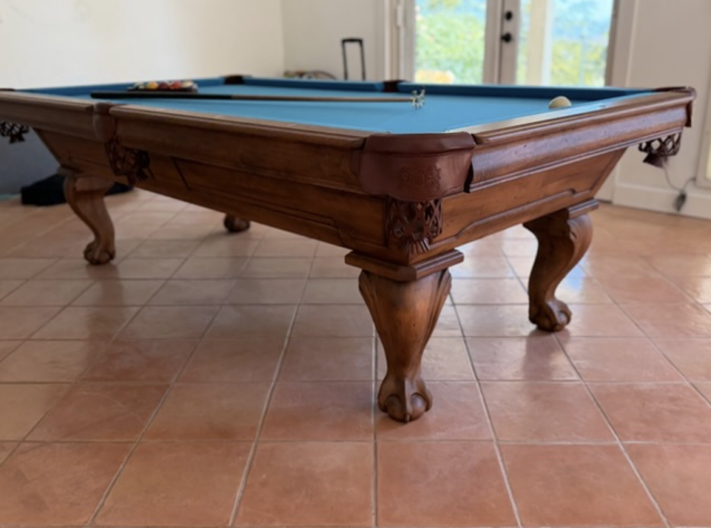 An elegant 8ft Olhausen pool table with gorgeous, detailed legs and a rich finish — a stunning addition that brings sophistication and performance to any game room.