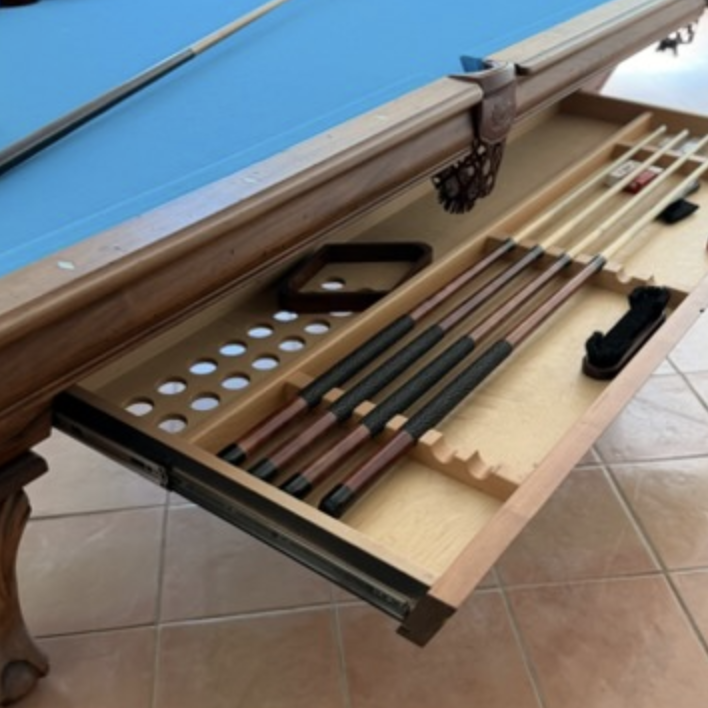 Includes a beautifully integrated storage drawer for neatly organizing cues and accessories.