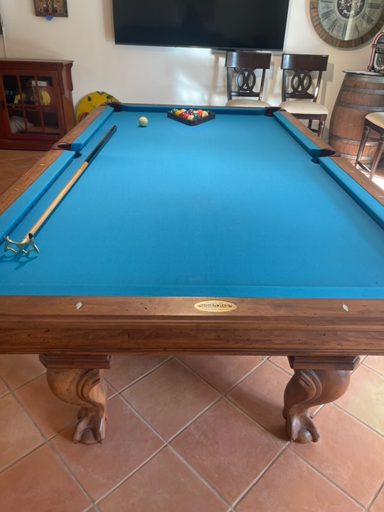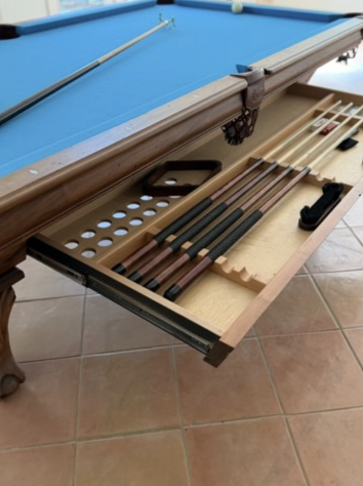 An elegant 8ft Olhausen pool table with gorgeous, detailed legs and a rich finish — a stunning addition that brings sophistication and performance to any game room.